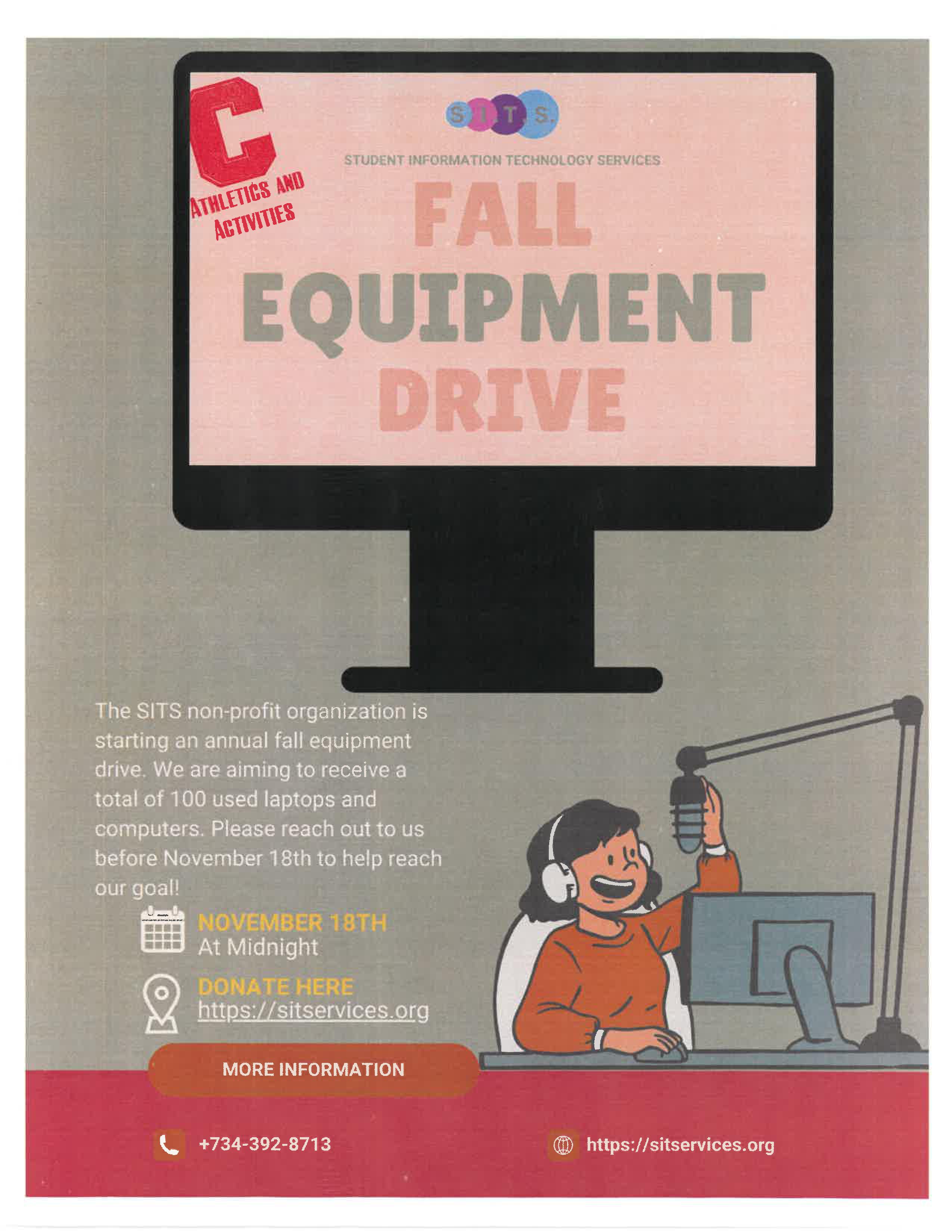 It's time to break out that old technology you have lying around! The SITS team is starting an annual fall equipment drive! We aim to receive a total of 100 used laptops and computers. Help us reach our goal before November 18th!
